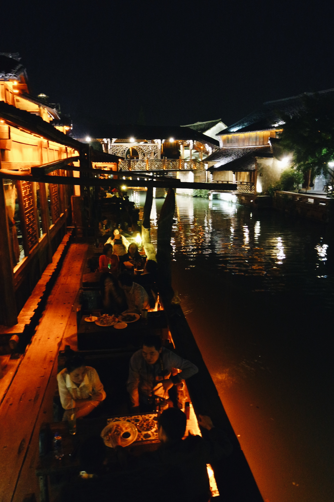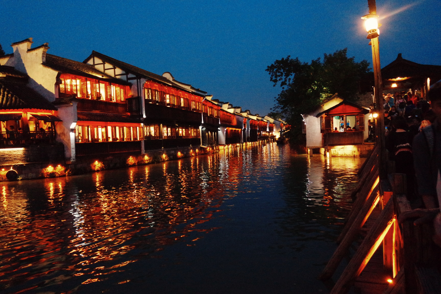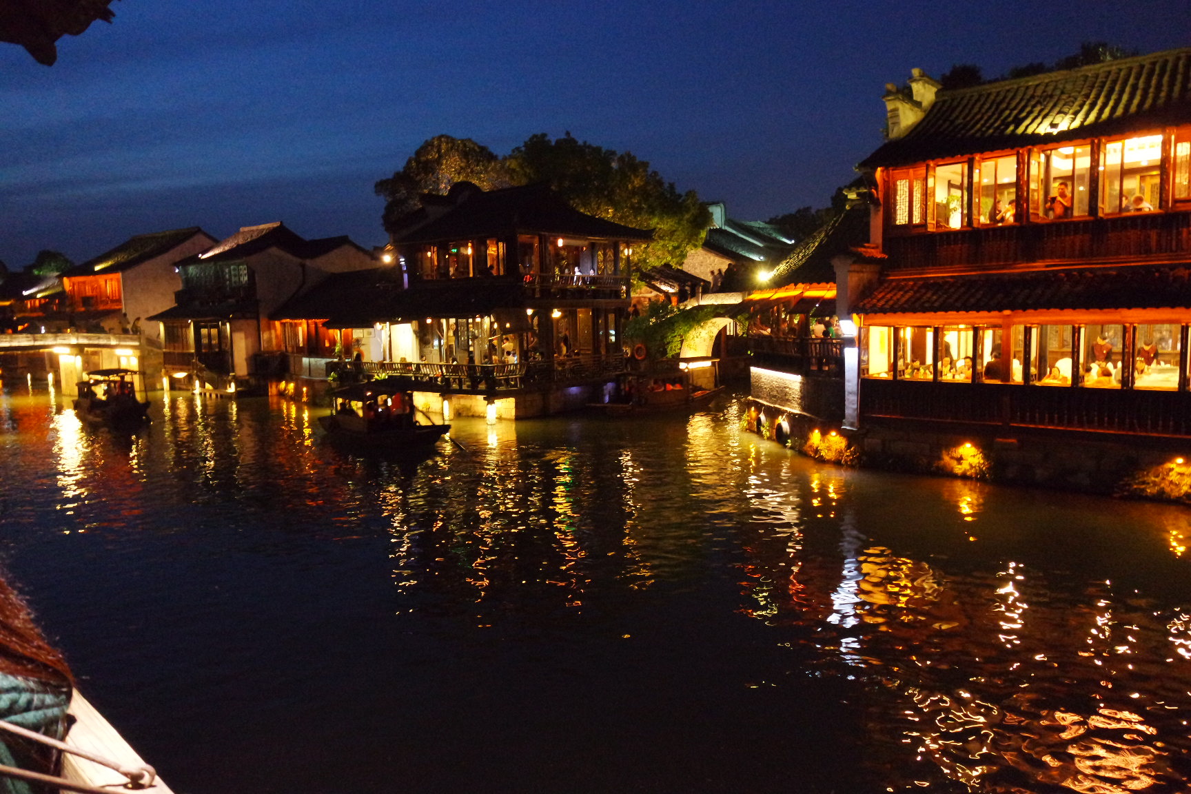 서책은 뗏목과 배의 중간 크기 정도의 배를 타고 둘러볼 수 있다. 물론 유료다. 하지만 무료로 아주 짧은 거리지만 탈수 있는 곳이 있었기에 우린 거기로.ㅎㅎ 서책에 도착해 엄청 분위기 좋아 보이는 레스토랑은 비쌀것 같아서 못가고 나름 저렴한 식당을 갔다. 거기도 운치있었다. 맛도 꽤 괜찮았다.(여행지 내에서 그 정도면.) 날이 어두워지고, 조명이 켜지자 우리의 피로는 싹 달아났다. 너무 아름다웠다. 저녁을 먹은 후 모두들 힘이 나서 앞다퉈 식당에서 나와 구경하기 시작했다. 서책이 동책보다 넓어서 그런지 삭ㄴ이 늦어서 그런지 이유는 알수 없지만 덜 붐볐다.(그렇다고 사람이 없는게 아니다.) 한참을 아름다운 모습에 감탄하며 구경하던 중 적당한 곳에서 단체사진을 한장 박았다. 풍경은 真漂亮(너무 예쁜데)인데 우리들은 완전 难看(못생김)ㅋㅋㅋㅋㅋㅋㅋㅋㅋ